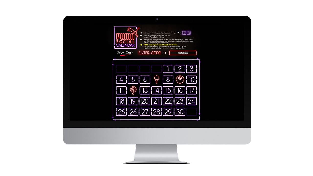 Over the course of one calendar month, Soci executed an extended Puma promotion through Facebook and Twitter garnering new engagement every day. Each day unique codes were posted on Puma's social platforms. The codes unlocked days on an advent-style calendar offering chances for players to win daily prizes. Repeat engagement was encouraged by allowing 1 entry per door and the more doors a participant unlocked, the better their odds were at winning the grand prize. The promotion exceeded 40,000 entrants and drove over 600,000 unique page views and interactions.